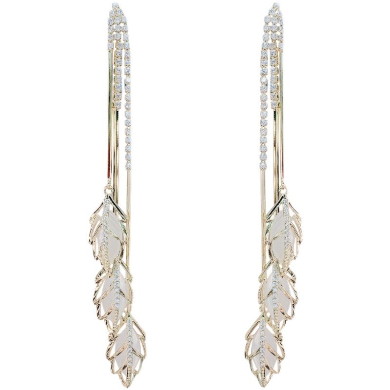 These leaf cat-eye tassel earrings feature a long drop silhouette inspired by natural leaf shapes. The cat-eye element adds soft depth, while the tassel design creates gentle movement.
