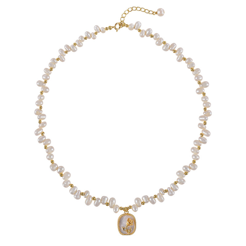 This necklace features a geometric rose mirror pendant paired with natural pearl elements. The reflective surface adds subtle visual interest while maintaining a clean and balanced overall look.