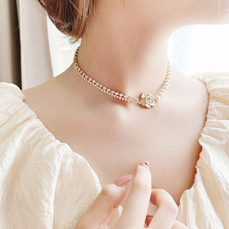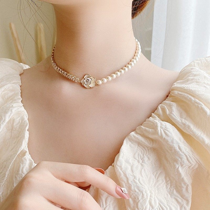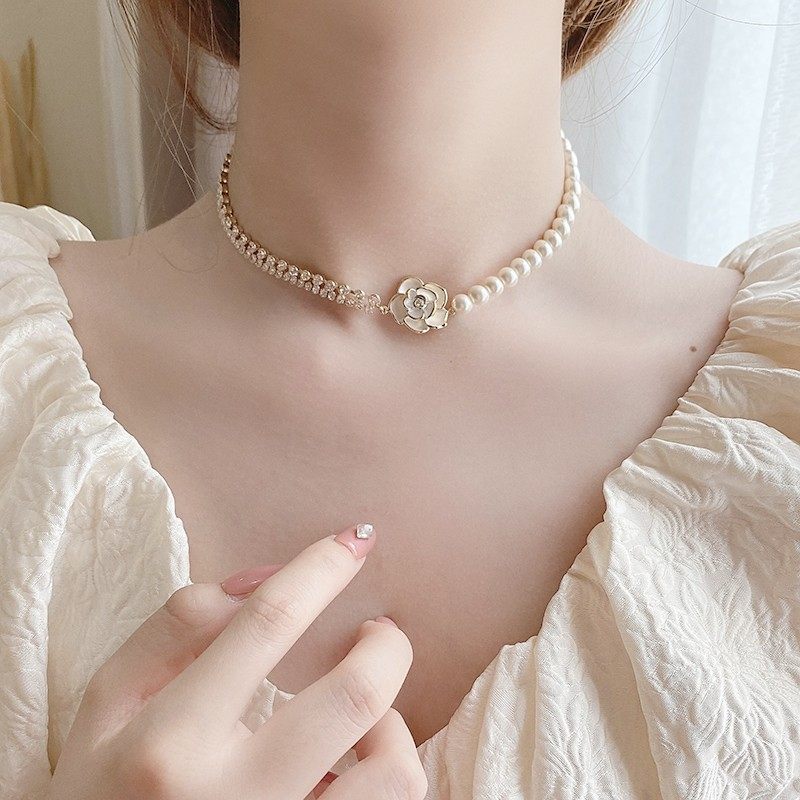 This necklace features a camellia flower design combined with pearl patchwork detailing. The mix of floral elements and pearls creates a balanced and refined appearance.