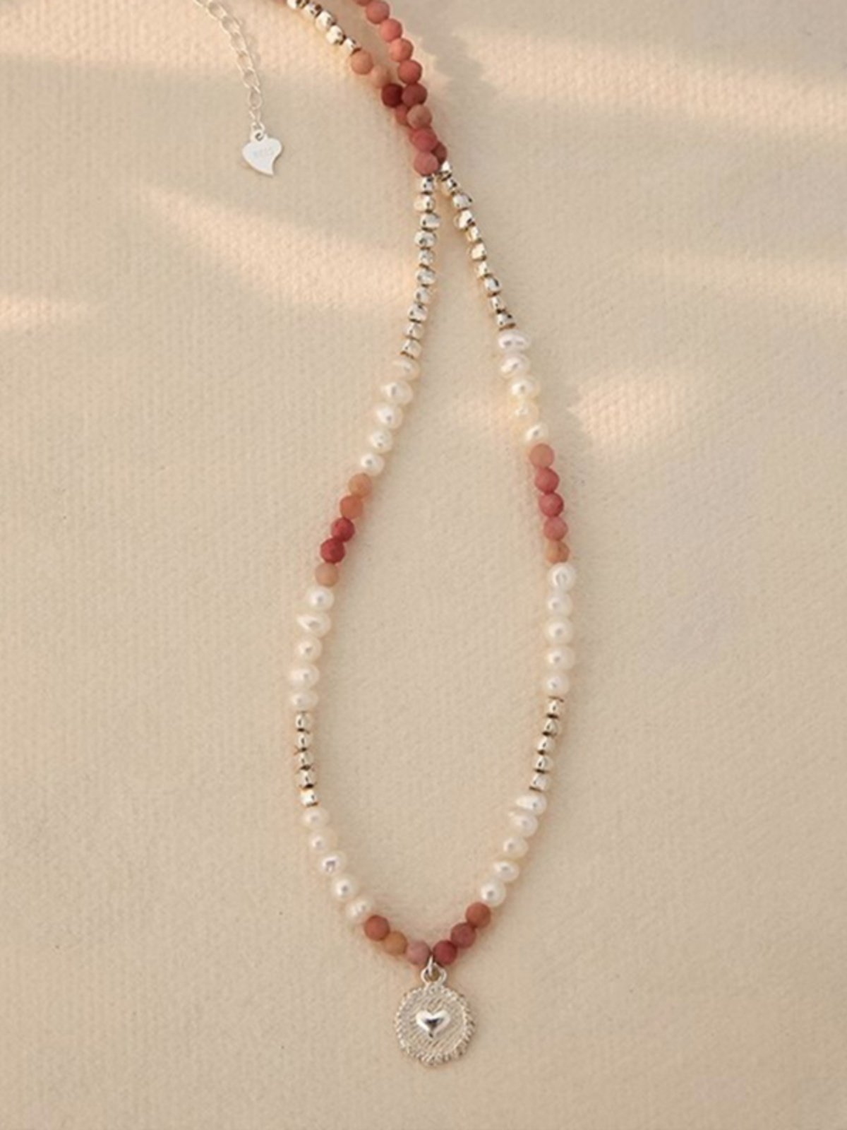 This silver clavicle necklace features a heart-inspired pendant paired with subtle pearl detailing. The balanced combination creates a clean and refined look suitable for everyday wear.