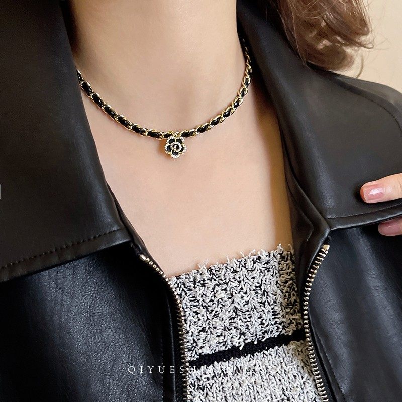This necklace features a camellia-inspired pendant paired with a black leather rope chain. The combination of floral detail and leather texture creates a balanced retro look with subtle character.