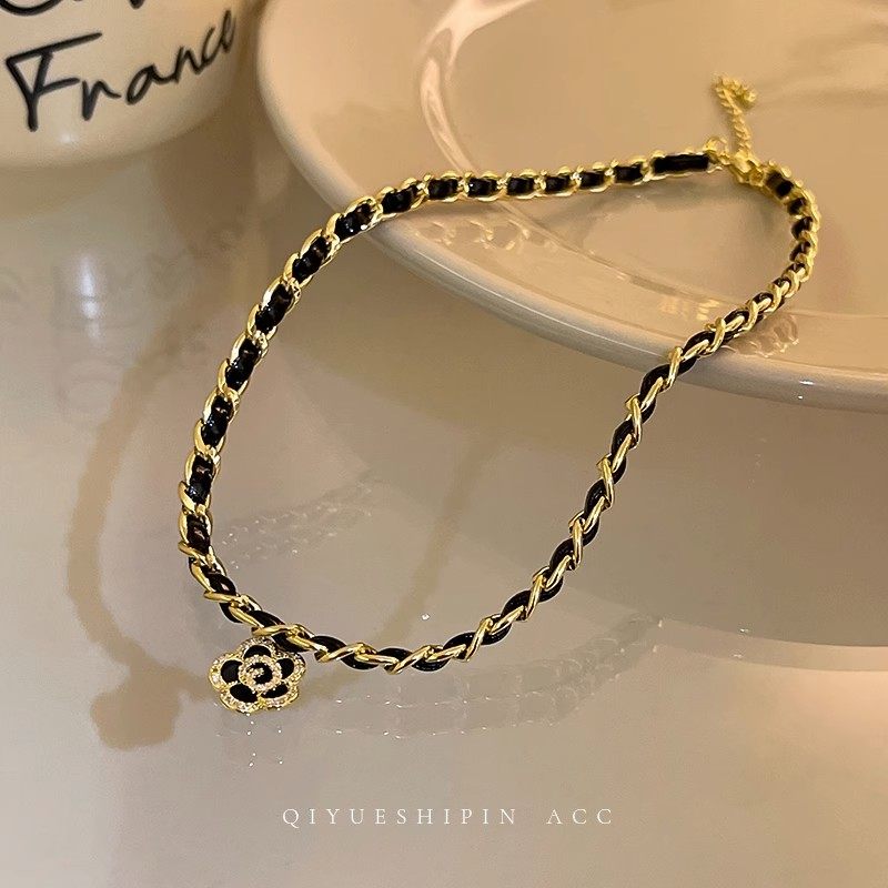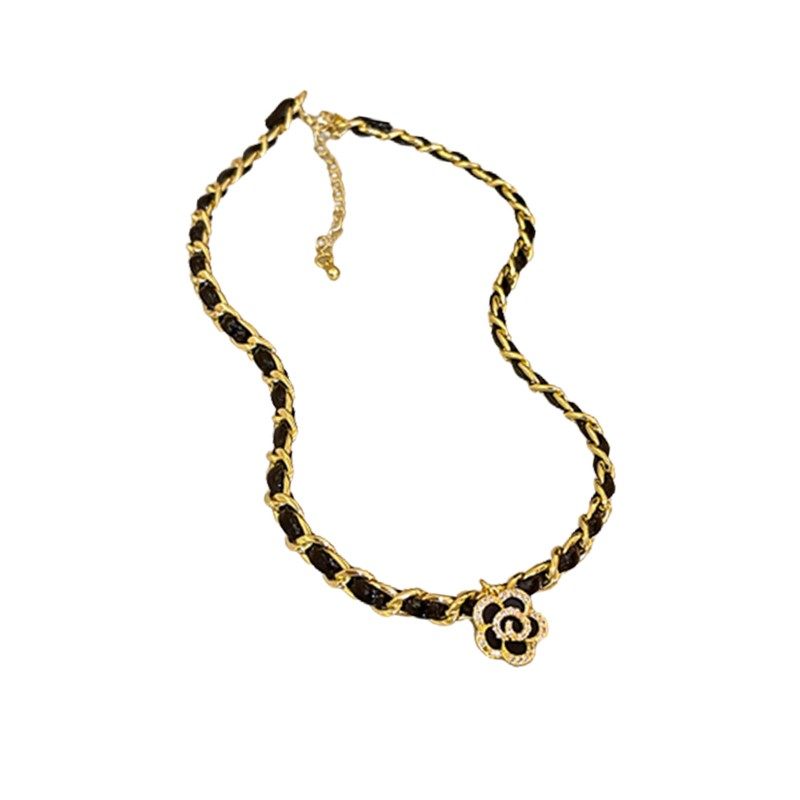 Black Leather Rope Camellia Pendant Necklace for Women – Retro Style Fashion Necklace