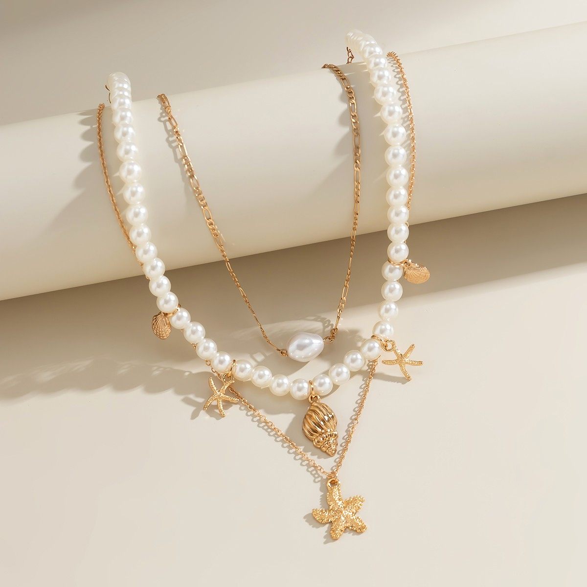 3-Piece Starfish Shell Imitation Pearl Necklace Set for Women – European & American Seaside Vacation Fashion Jewelry Accessories