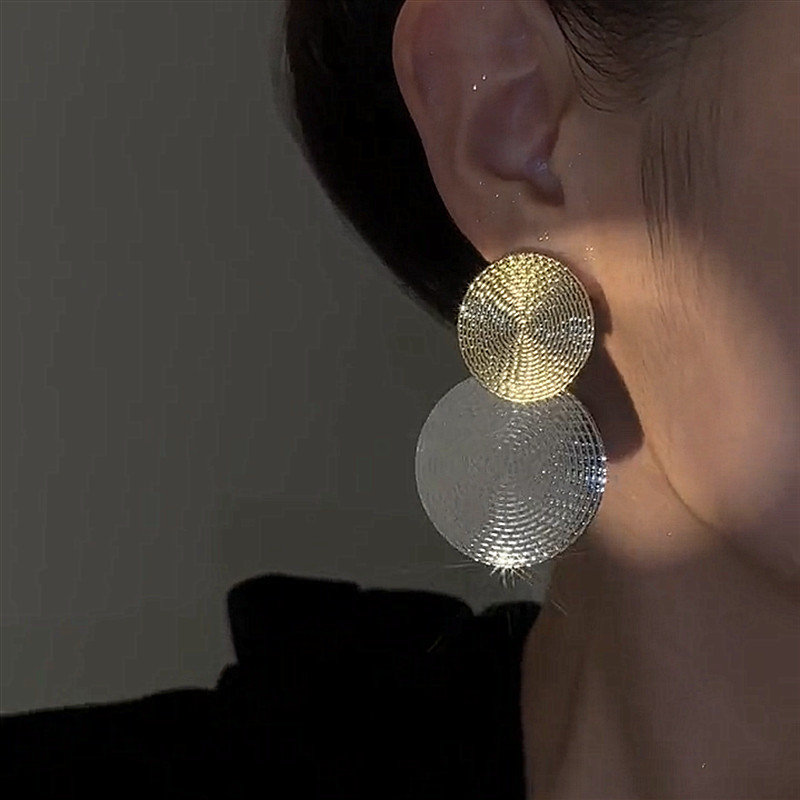 These large circle earrings feature a bold round silhouette accented with sequin detailing. The layered surface reflects light softly, creating visual depth while maintaining a clean structure.