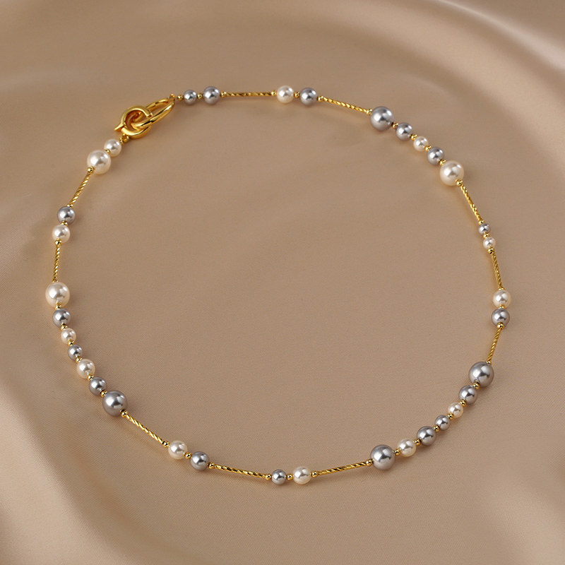 This pearl necklace features mixed color round pearls arranged on a long chain design. The varied pearl tones create natural contrast while maintaining a clean and balanced appearance.