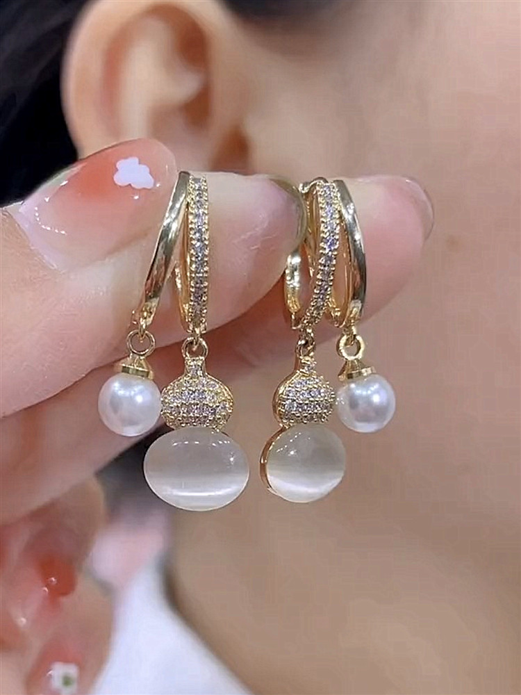 Cat Eye Stone Gourd Pearl Stud Earrings for Women – Elegant Pearl Ear Button Fashion Jewelry
