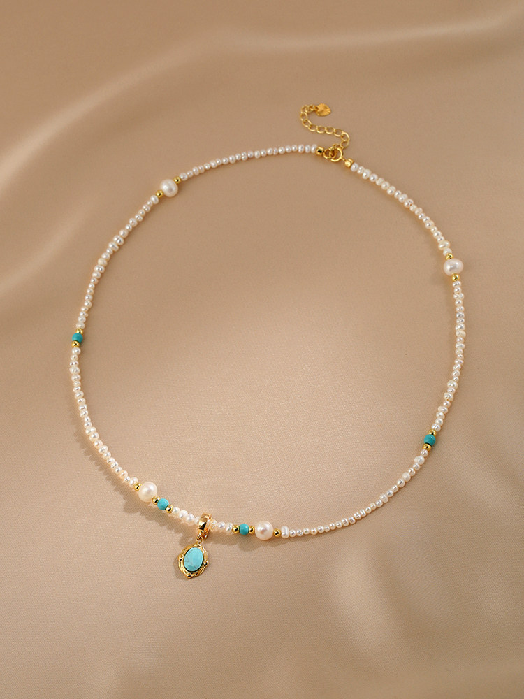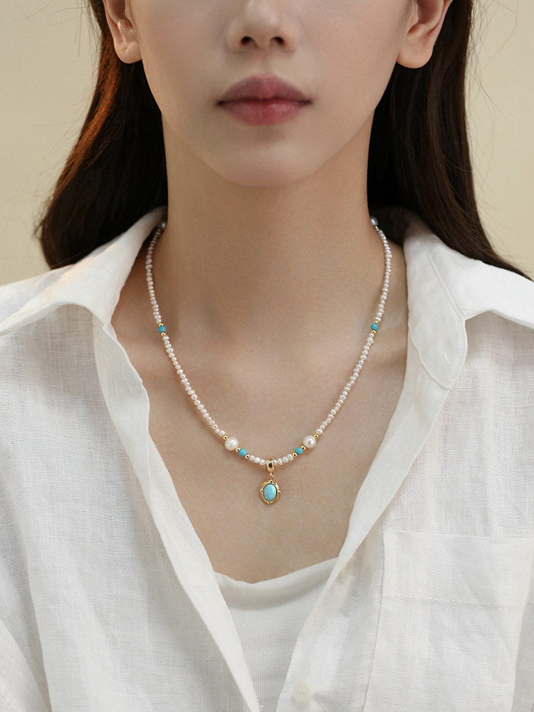 This necklace features natural pearls combined with millet bead splicing and turquoise beads. The mixed materials create a balanced contrast while maintaining a clean and wearable design.