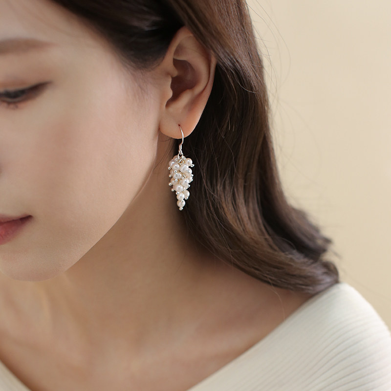 These natural pearl earrings feature a grape cluster–inspired tassel design with layered pearl details. The flowing structure creates gentle movement while reflecting a classic retro aesthetic.