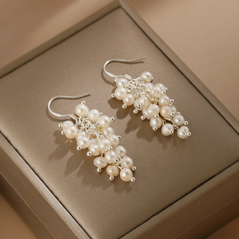 Natural Pearl Tassel Grape Cluster Earrings for Women – Retro Style S925 Silver Ear Hook Earrings