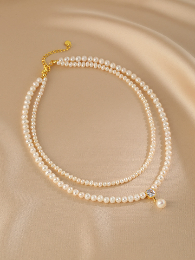 This double layer necklace features natural pearl rice beads arranged in a balanced layered design. The compact bead size creates a clean and lightweight appearance suitable for everyday wear.