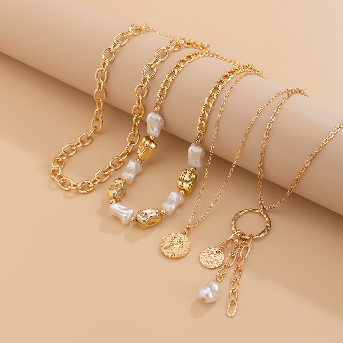 This European and American style Cuban locket layered necklace combines imitation pearls with a bold metal portrait pendant, creating a distinctive punk-inspired look. The layered design adds depth and dimension, making it a standout accessory for modern fashion styling.