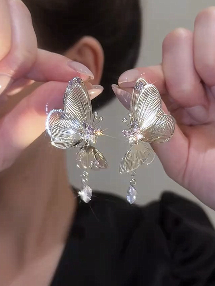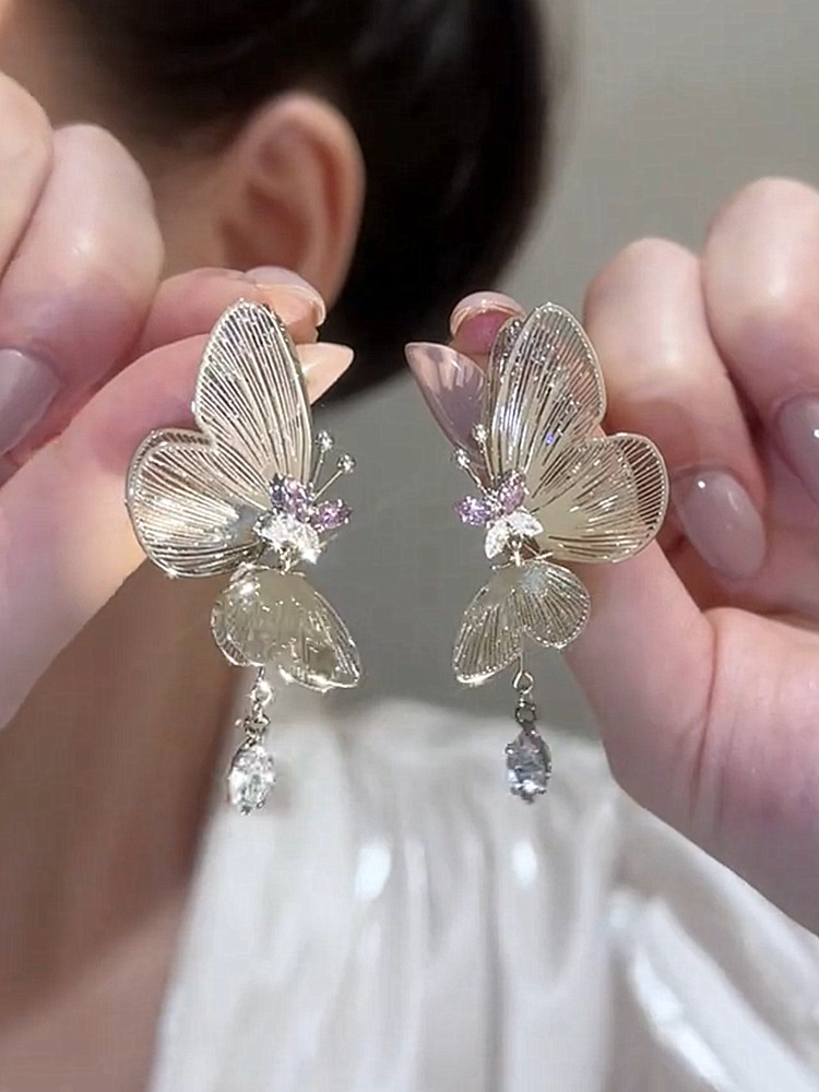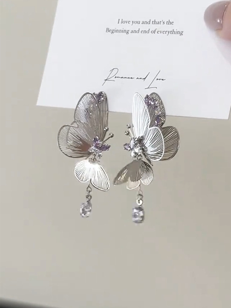 These hollow butterfly earrings feature a three-dimensional design with an open silver structure. The layered butterfly shape adds depth, while zircon accents provide subtle sparkle.