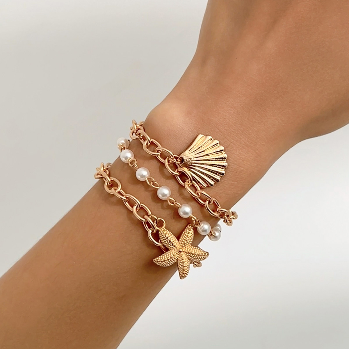 This 3-Piece Starfish & Scallop Imitation Pearl Bracelet Set is designed for women who love seaside-inspired, European and American fashion jewelry. Featuring a harmonious combination of starfish motifs, scallop shell elements, and imitation pearl accents, this set captures the essence of summer beach style.