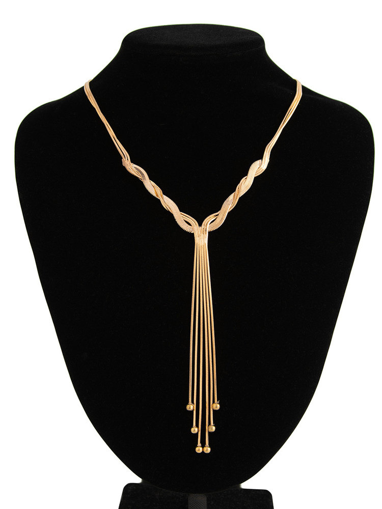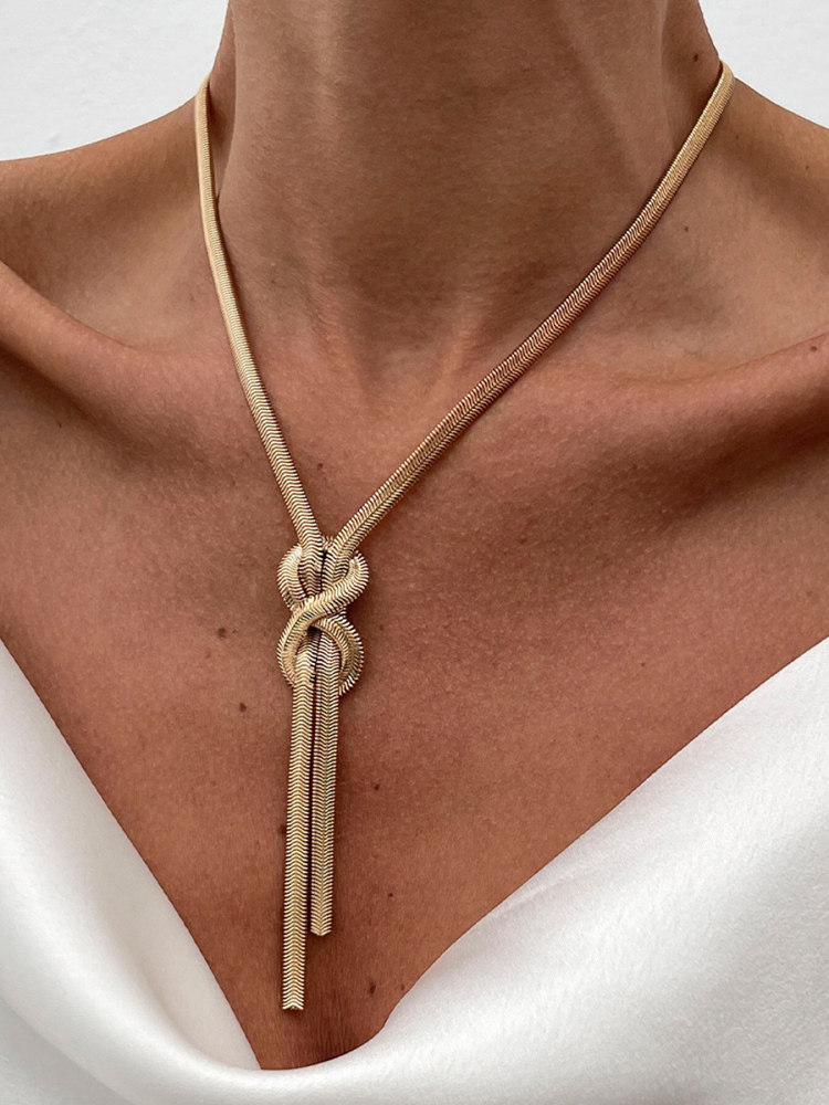 The Love V Gold Knotted Tassel Snake Chain Necklace is designed for women who appreciate minimalist yet expressive fashion jewelry. Featuring a smooth snake-shaped chain, a refined gold-tone knotted detail, and a flowing tassel accent, this long necklace creates a graceful, elongated silhouette.