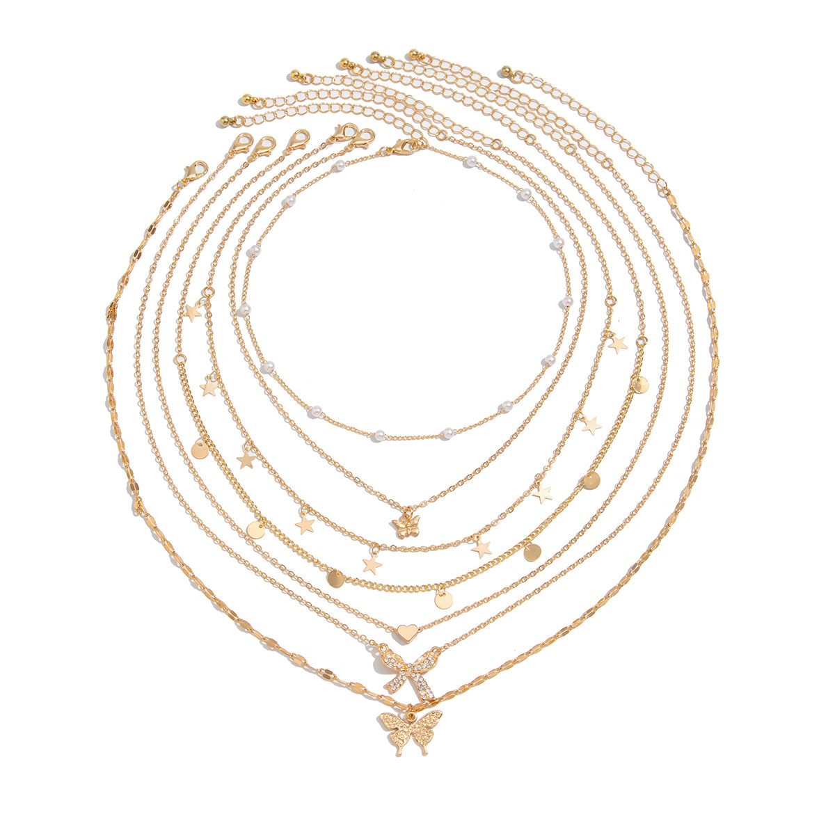 7-Piece Star Butterfly & Peach Heart Necklace Set – Layered Clavicle Chain Design