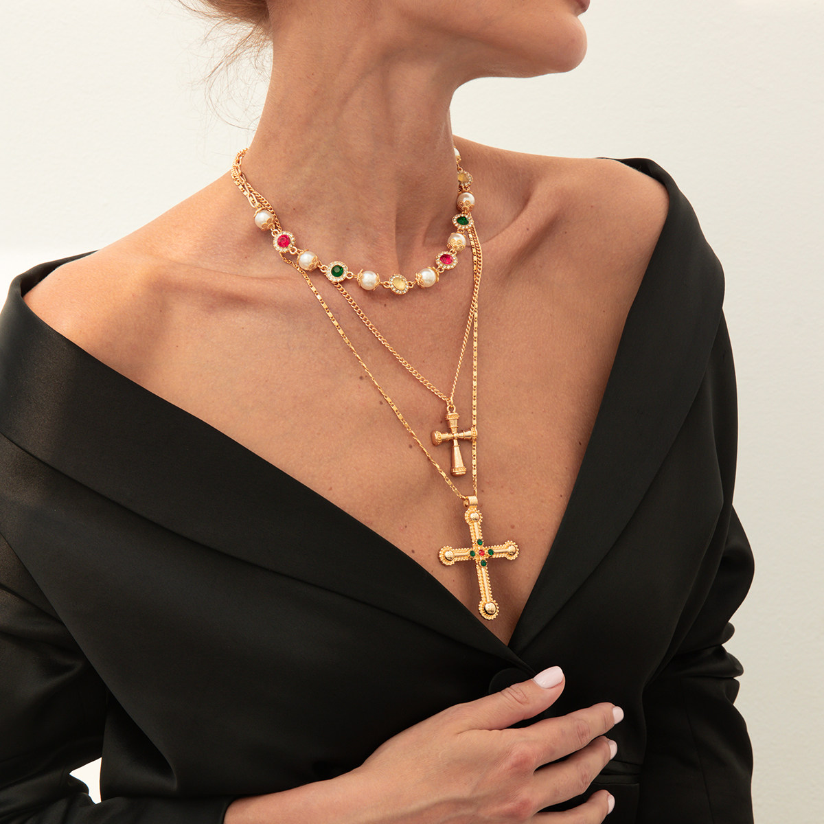 This 3-piece diamond-style cross necklace set features a clean layered clavicle chain design with classic cross pendants accented by diamond-style detailing. The layered structure creates a balanced and elegant look suitable for everyday wear.